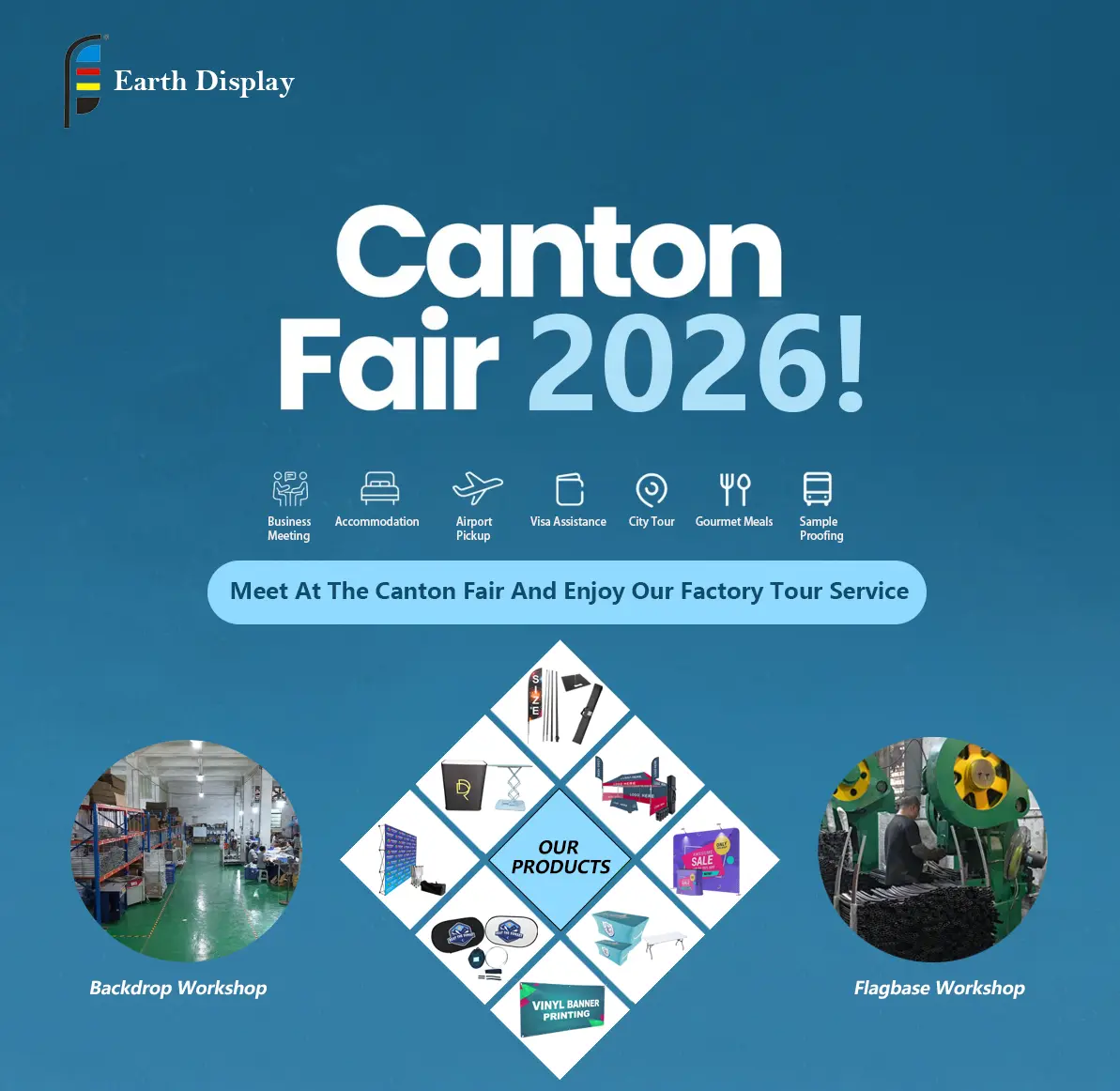 2026 Kanton Fuarı yaklaşıyor ve biz Earth Display olarak sizi orada görmeyi gerçekten umuyoruz. On yılı aşkın bir süredir kuş tüyü bayraklar, pop-up arka planlar, bayrak tabanları, özel vinil afişler (temelde sergiler ve reklamlar için her şey) yapıyoruz. Bu sefer sadece çevrimiçi konuşmak yerine, size ne yaptığımızı yüz yüze göstermek istiyoruz.